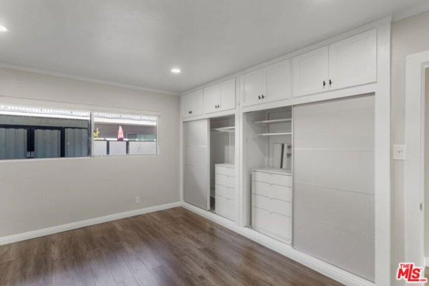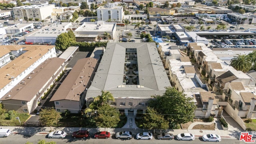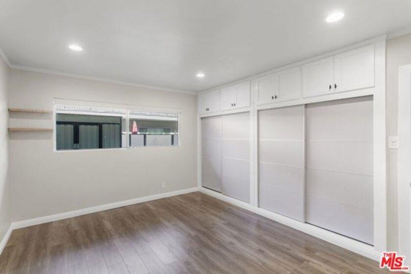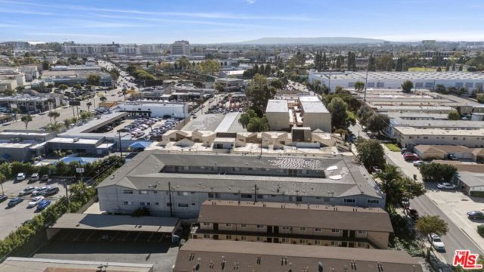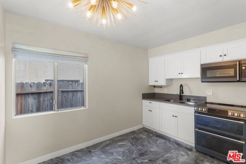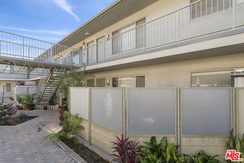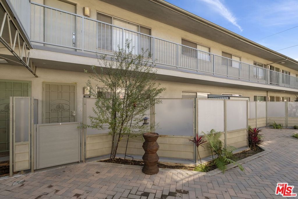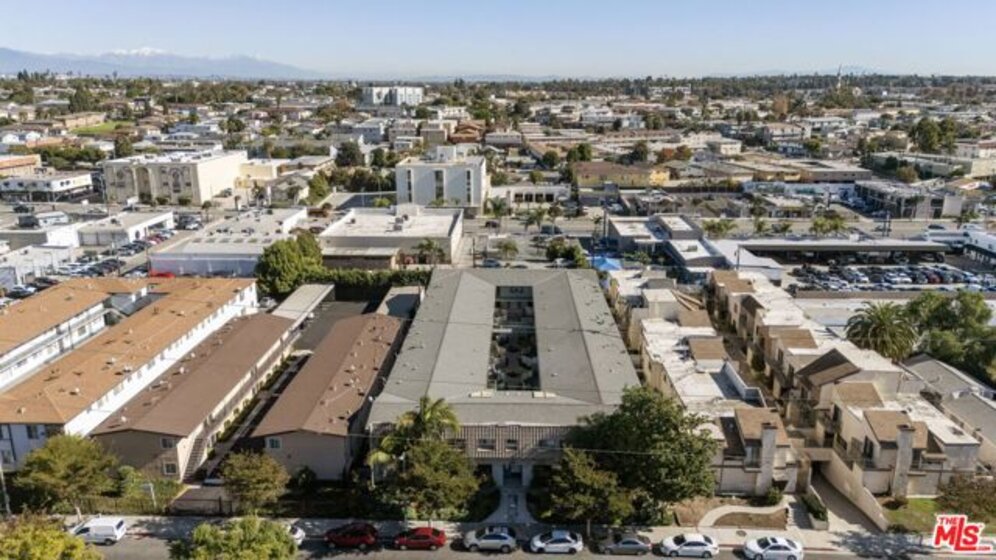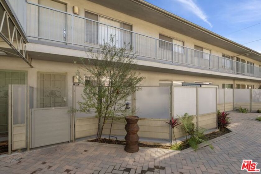 Discover this 2 bed 1 bath ground floor condo tucked inside a classic mid century courtyard community. A private enclosed patio sets the tone, an ideal spot to relax or enjoy a quiet moment outdoors. Step inside to a bright open living room with recessed lighting, built in shelving, and a large window that fills the space with natural light. The remodeled kitchen blends clean modern finishes with mid century flair, featuring white cabinets, stone countertops, newer appliances, and a sputnik style light above the dining area. The updated bathroom feels fresh and elegant with a stone top vanity, gold toned hardware, a black arched mirror, and a tiled shower/tub. Both bedrooms offer a minimalist calm aesthetic anchored by a custom floor to ceiling wardrobe system that maximizes storage. Enjoy in unit laundry, an extra storage closet, a private shed, and one secured subterranean parking space with access from Lamos Street. The complex offers secured entry, landscaped courtyards, and classic mid century design elements throughout. Located near Inglewood's growing sports (Sofi and Intuit Dome) and entertainment district (Kia Forum), shopping, dining, public transportation, and convenient 405 access to the Westside and Beach Cities.