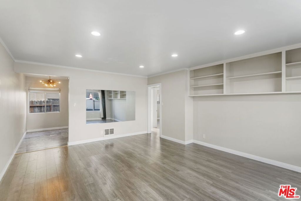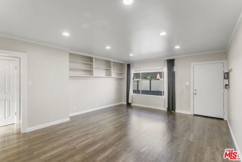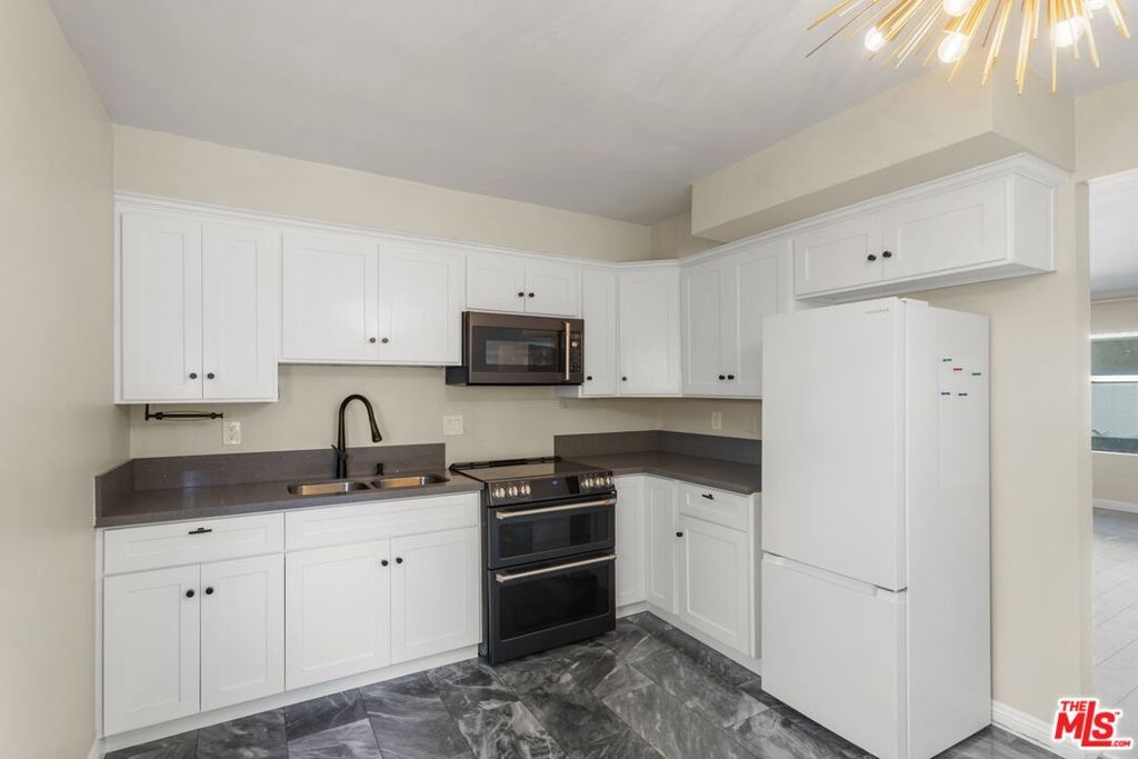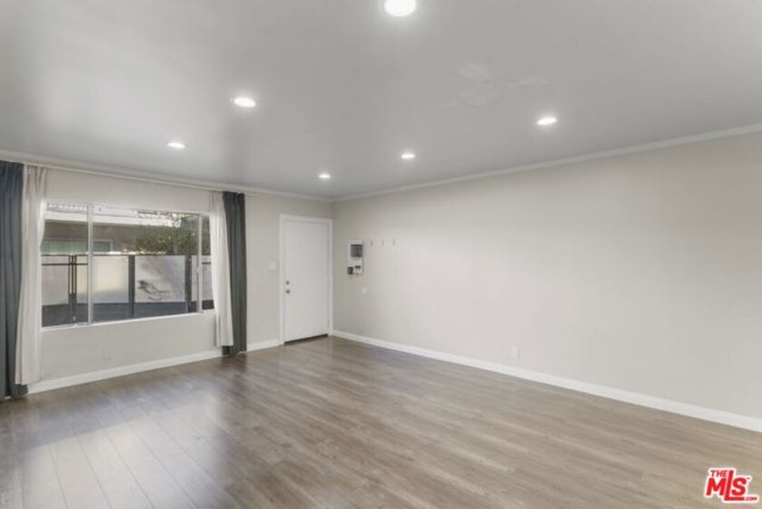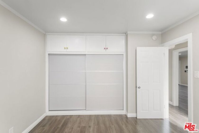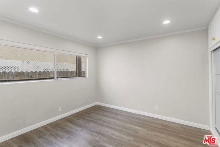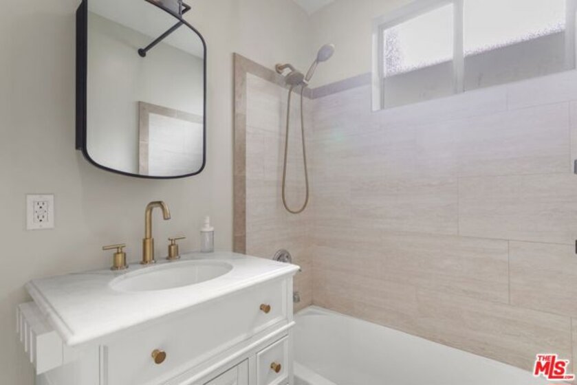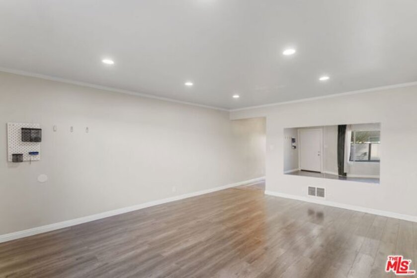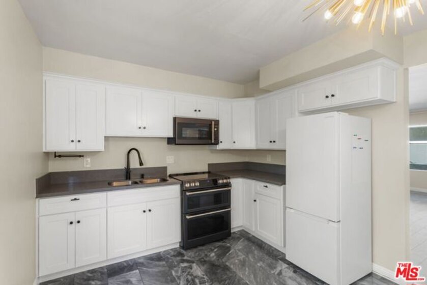 Discover this 2 bed 1 bath ground floor condo tucked inside a classic mid century courtyard community. A private enclosed patio sets the tone, an ideal spot to relax or enjoy a quiet moment outdoors. Step inside to a bright open living room with recessed lighting, built in shelving, and a large window that fills the space with natural light. The remodeled kitchen blends clean modern finishes with mid century flair, featuring white cabinets, stone countertops, newer appliances, and a sputnik style light above the dining area. The updated bathroom feels fresh and elegant with a stone top vanity, gold toned hardware, a black arched mirror, and a tiled shower/tub. Both bedrooms offer a minimalist calm aesthetic anchored by a custom floor to ceiling wardrobe system that maximizes storage. Enjoy in unit laundry, an extra storage closet, a private shed, and one secured subterranean parking space with access from Lamos Street. The complex offers secured entry, landscaped courtyards, and classic mid century design elements throughout. Located near Inglewood's growing sports (Sofi and Intuit Dome) and entertainment district (Kia Forum), shopping, dining, public transportation, and convenient 405 access to the Westside and Beach Cities.